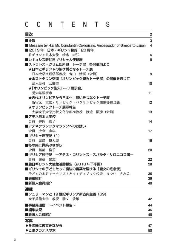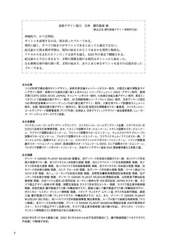 Information 会報第156号 準備中です . . 会報第155号 準備中です ... 会報第143号 澄み切ったブルー 表紙は、会員で藤代デザイン事務所代表の藤代範雄様。国内外で活躍され、美術館、博物館に収蔵されている作品は多数。昨今、現地に赴き沖縄琉球ガラスやムラノ島にてヴェネツィアンガラス制作 に取り組まれ、素晴らしい作品を次々と生み出している。今回は、その一つで地中海の深い青を彷彿とさせる作品を表紙にあしらっていただいた。 会報第142号 ミコノス島 表紙は会員の写真家増見芳隆様。「エーゲ海に浮かぶ宝石箱」と称されるミコノス島を30年ほど前にヘリコプターをチャーターして贅沢に撮影された写真。エーゲ海に通われ、「Aegean Cat」、「Aegean Dog」などのカレンダーの受賞など数多くの入賞歴があります。 会報第141号 勝連城(かつれんぐすく・かつれんじょう) 表紙は、会員の児島慎太郎様。パルテノン神殿のような構図のこの絵は、沖縄の勝連城が描かれていますが、これが憧れのギリシャでの制作に繋がっていきます。 会報第140号 「微風に舞い」(そよかぜにまい)<ペルセポネー> 会員千葉先生のギリシャ神話シリーズです。死者の国で暮らすデメテルの娘ペルセポネーは、時期が来ると地上の母のもとに戻れる喜びと母の喜びとで、蘇った大地が春の花で溢れる。この再会が四季をもたらしたのだ。 ページトップへ